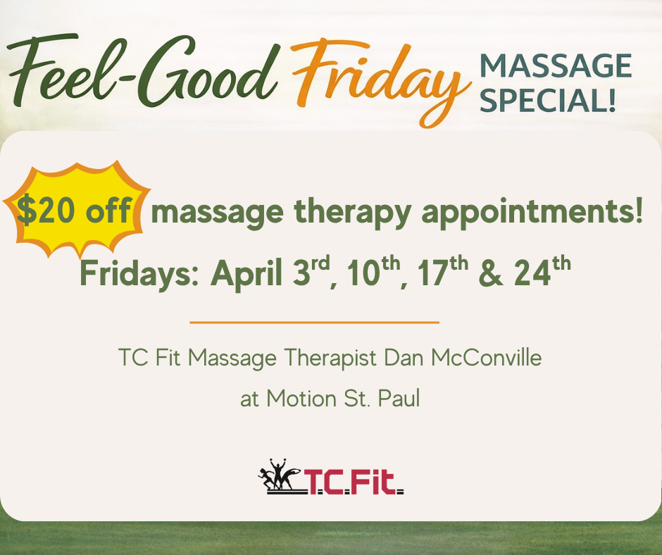 Join TC Fit massage therapist Dan McConville at Motion St. Paul—with a special Friday rate for the month of April. Dan offers customized massage sessions specializing in neuromuscular techniques, targeting chronic pain, muscle trigger points and nerve compression. Expect a balance of relaxation and relief through purposeful, moderate-pressure techniques.